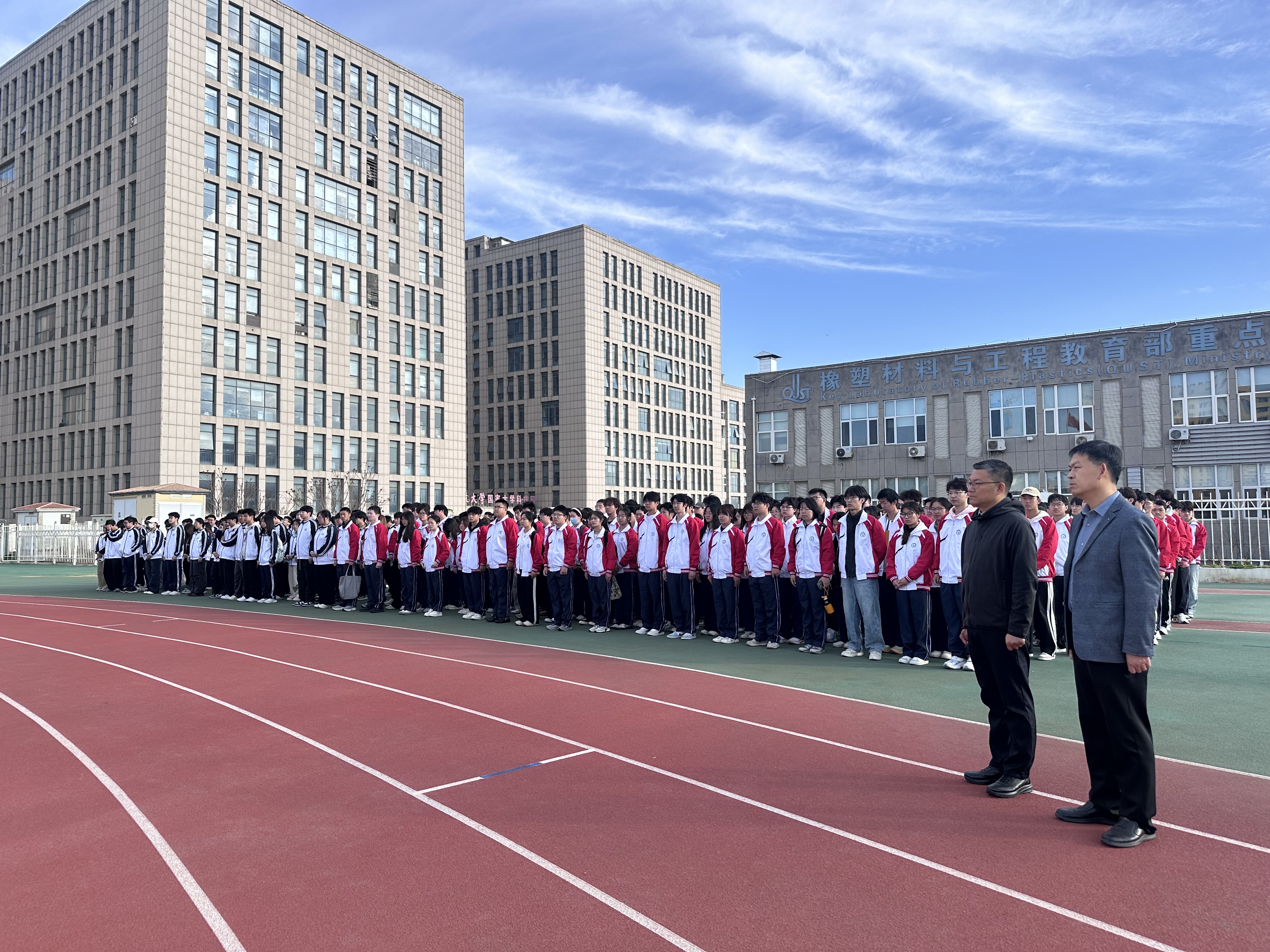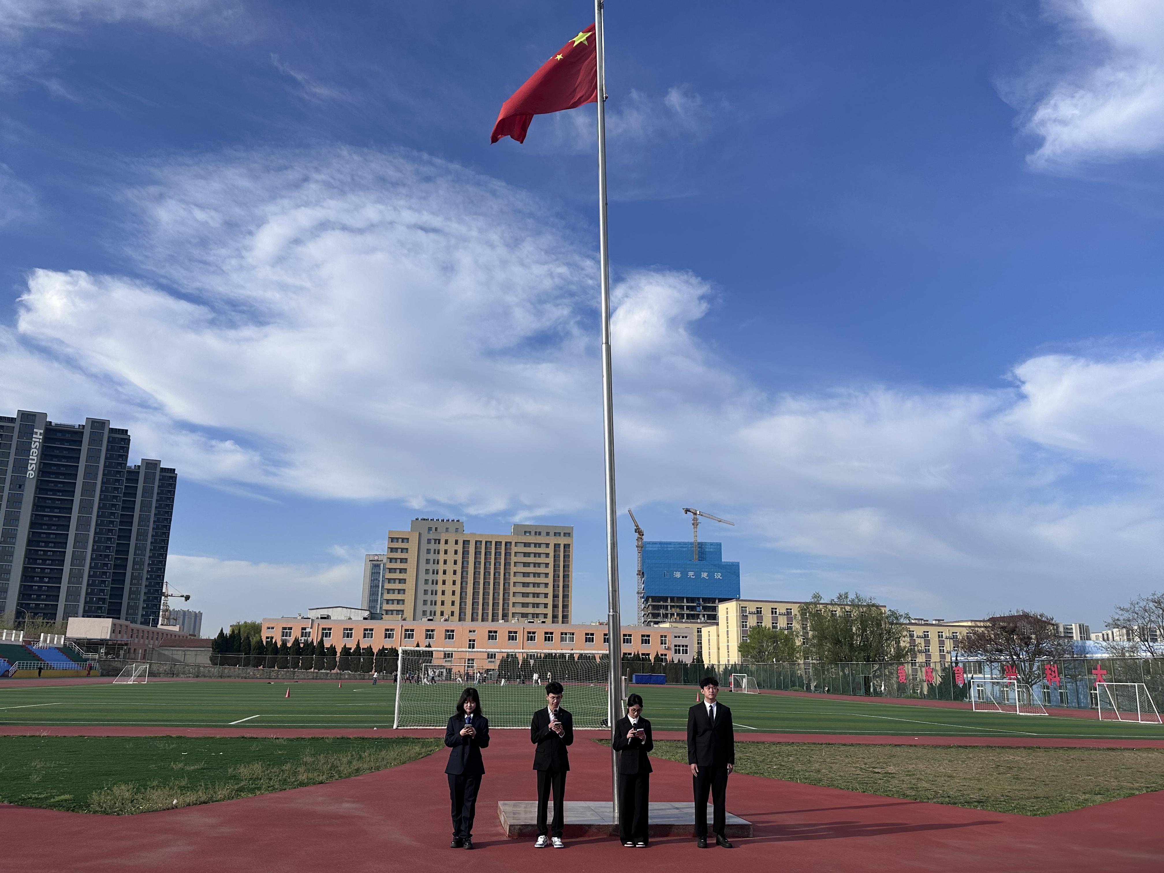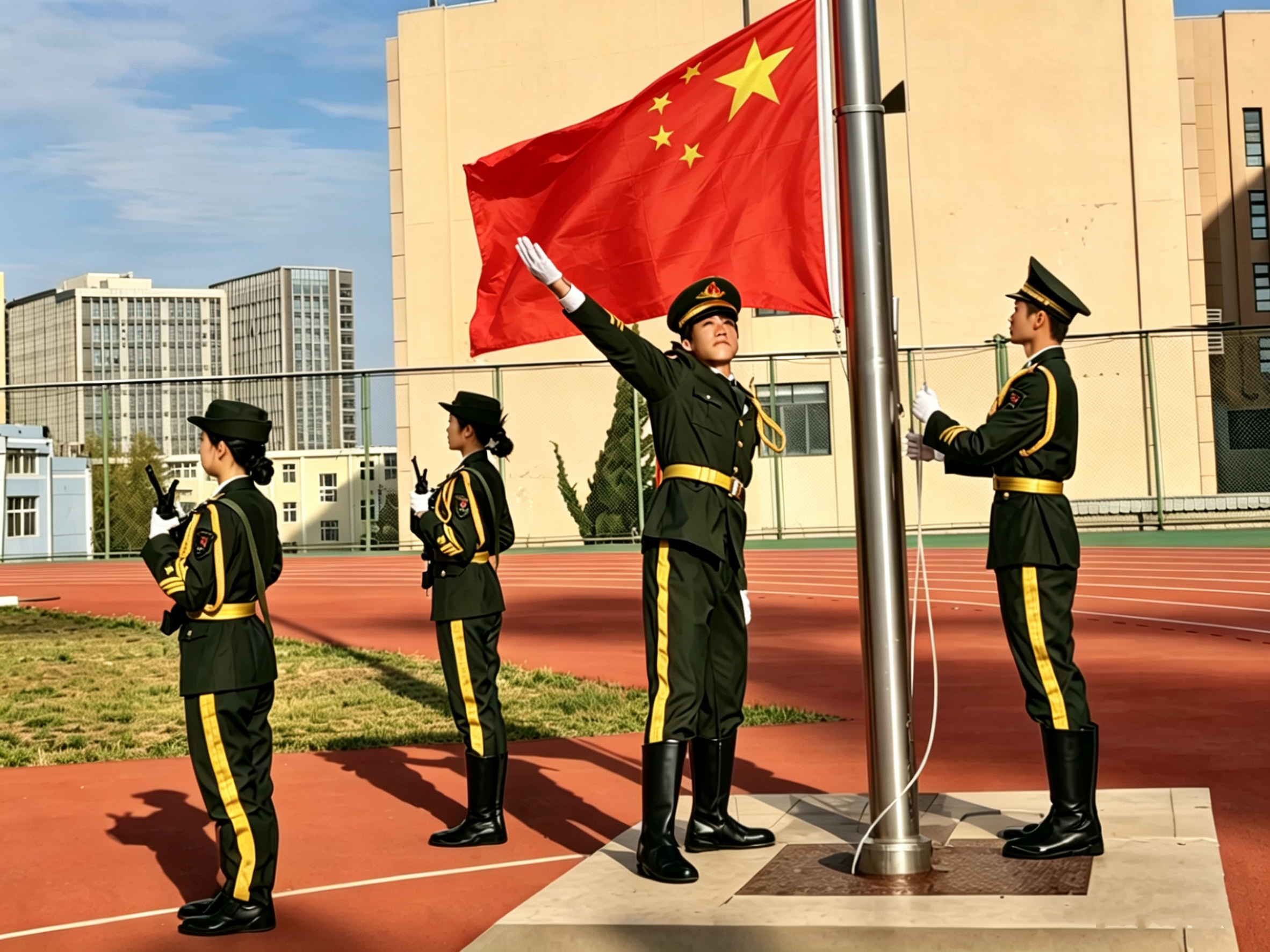仪式在雄壮的《义勇军进行曲》中正式开始,五星红旗冉冉升起,全体师生肃立注目,行注目礼,共同感受庄严的爱国氛围。